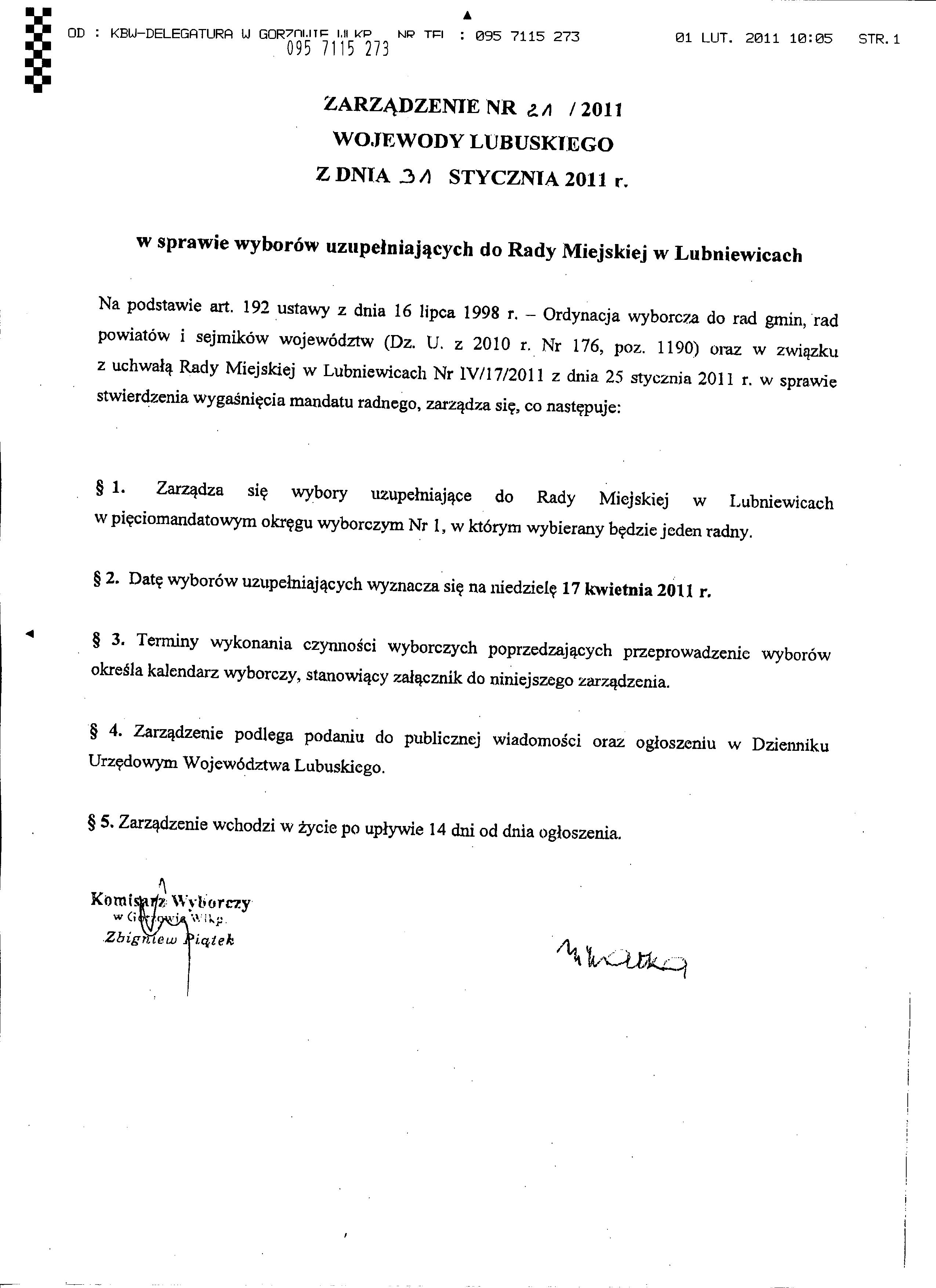 2011-02-02 09:23 - modyfikacja zawartości strony `Zarządzenie nr 21/2011 Wojewody Lubuskiego z dnia 31 stycznia 2011 r. w sprawie wyborów uzupełniających do Rady Miejskiej w Lubniewicach` przez użytkownia id1: Waldemar Gatzka