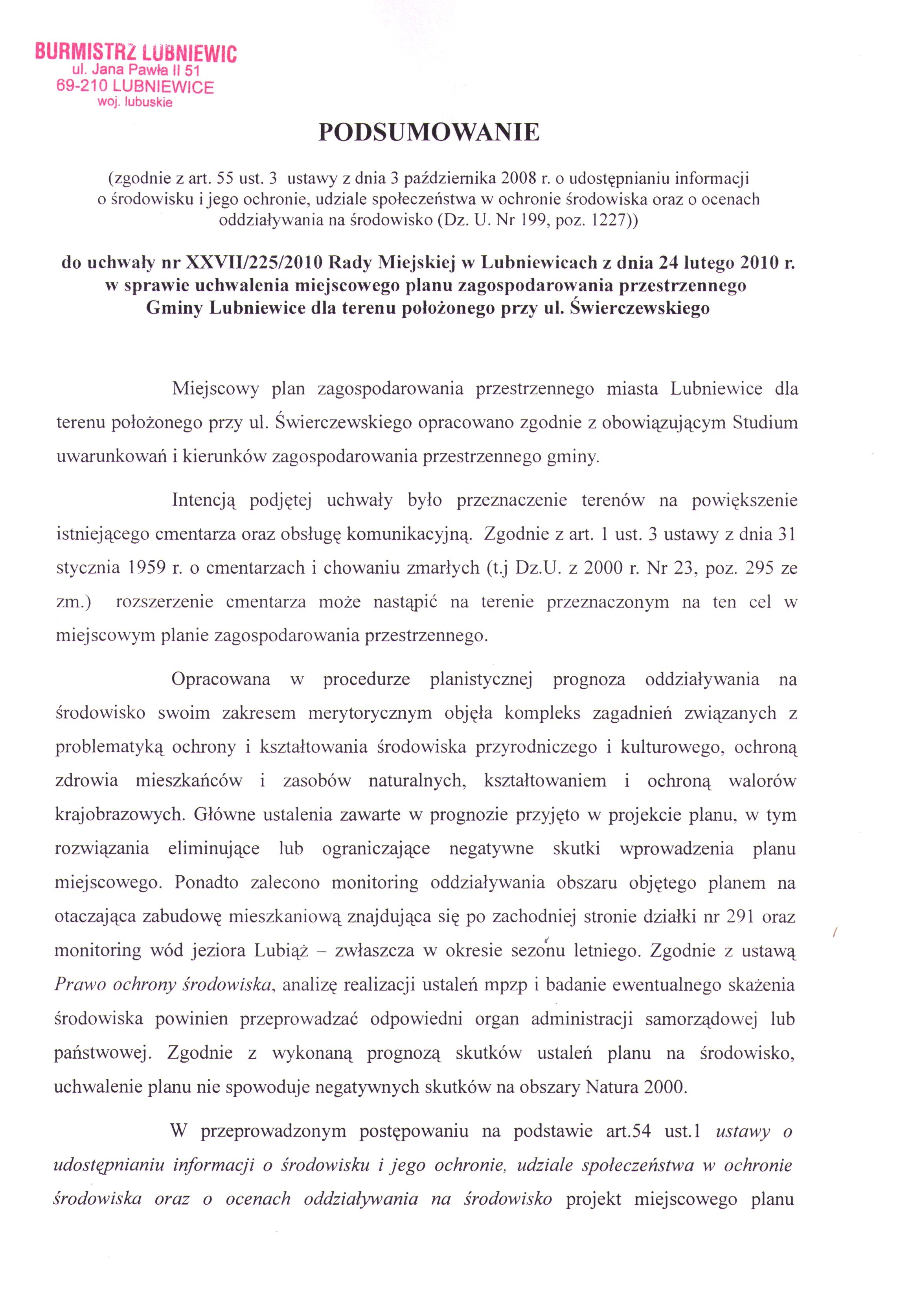 miejscowego planu zagospodarowania przestrzennego Gminy Lubniewice dla terenu położonego przy ul. Świerczewskiego w Lubniewicach Uchwałą Nr XXVII/225/2010 Rady Miejskiej w Lubniewicach z dnia 24 lutego 2010 r.